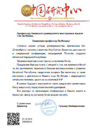 2019年10月23日,公司原PA捕鱼官方网站经理、俄罗斯中心主任、国内知名翻译家、普希金奖章获得者李英男教授,受哈萨克斯坦中国研究中心的邀请,赴哈萨克斯坦努尔苏丹市参加为纪念中华人民共和国建立70周年而举办的专题演讲会。