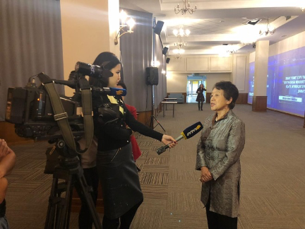 李英男教授做了题为“以见证人的眼光看中国70年变化”的演讲。 她在演讲中向参加活动的哈方代表介绍了70年来中国翻天覆地的发展变化,并以她的父亲、中国共产党早期领导人李立三同志为例讲述了中国共产党人的初心。会后李英男教授接受了哈方电视台的采访。