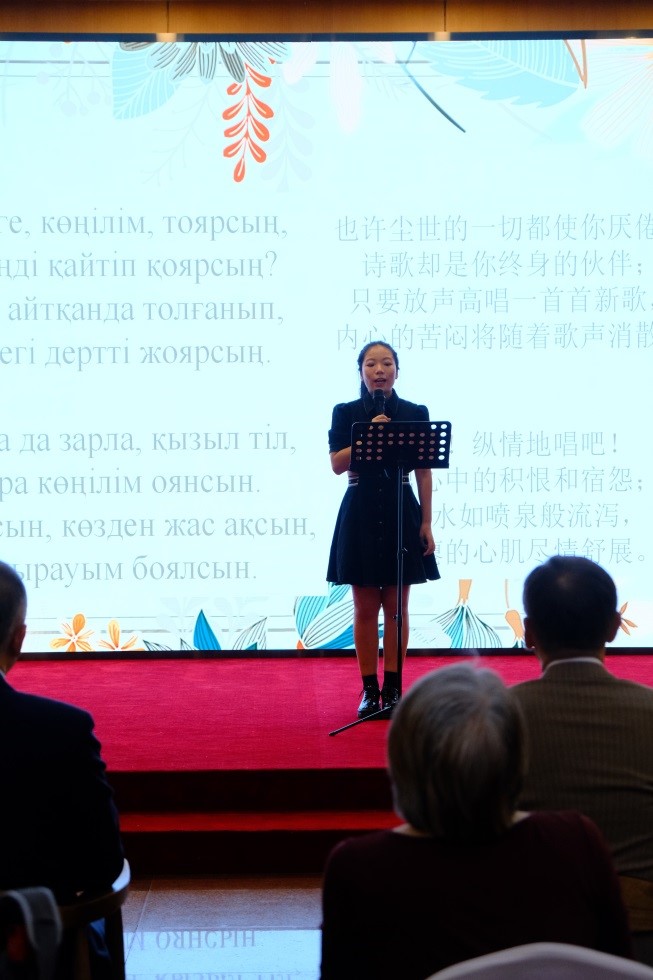 公司2020级俄语复合哈萨克语专业的黄雨昕同学现场朗诵了阿拜的诗歌《诗歌是你终身的伙伴》,张娉婷、谢璐骏、冯潇三位同学则以视频的方式朗诵了阿拜诗歌《心如海洋,激情如闪光的宝石》《无风的夜》《年轻时不曾关注知识的作用》。同学们饱含激情的演绎中展现出了对哈萨克斯坦文化的热爱和历史的深刻认识与理解。