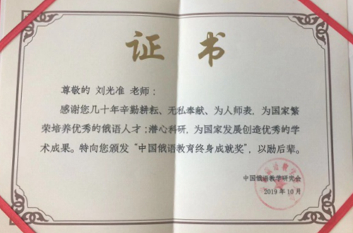 公司刘光准教授荣获“中国俄语教育终身成就奖”