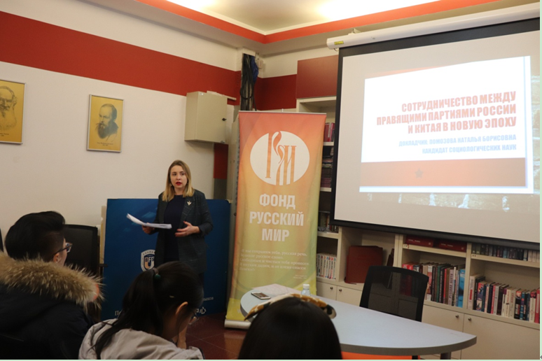 娜塔莉亚·波莫佐娃表示“统一俄罗斯党”非常重视同中国共产党的交流与合作,新时代条件下,俄罗斯将中国看作可靠、亲近的邻居和朋友,中俄关系也达到历史上最高水平,这也更加促进“统一俄罗斯党”和中国共产党的交流与合作的广度和深度。她还表示,俄罗斯与中国在反对霸权主义等方面具有共同看法。随后,向听众介绍了俄罗斯的政党现状,2019年9月8日俄罗斯联邦主体各级地方会议选举概况,“统一俄罗斯党”的基本情况,并且详细介绍了她本人负责的对外交流活动方向。还有“统一俄罗斯党”同中国共产党的交流协作机制,“统一俄罗斯党”的政党架构、人才培养与储备、政党宣传同现代技术结合等等多个方面的介绍。讲座的最后,娜塔莉亚·波莫佐娃表示了俄罗斯维护国家主权,反对干涉他国内政的态度,祝愿中俄两国友谊长存。