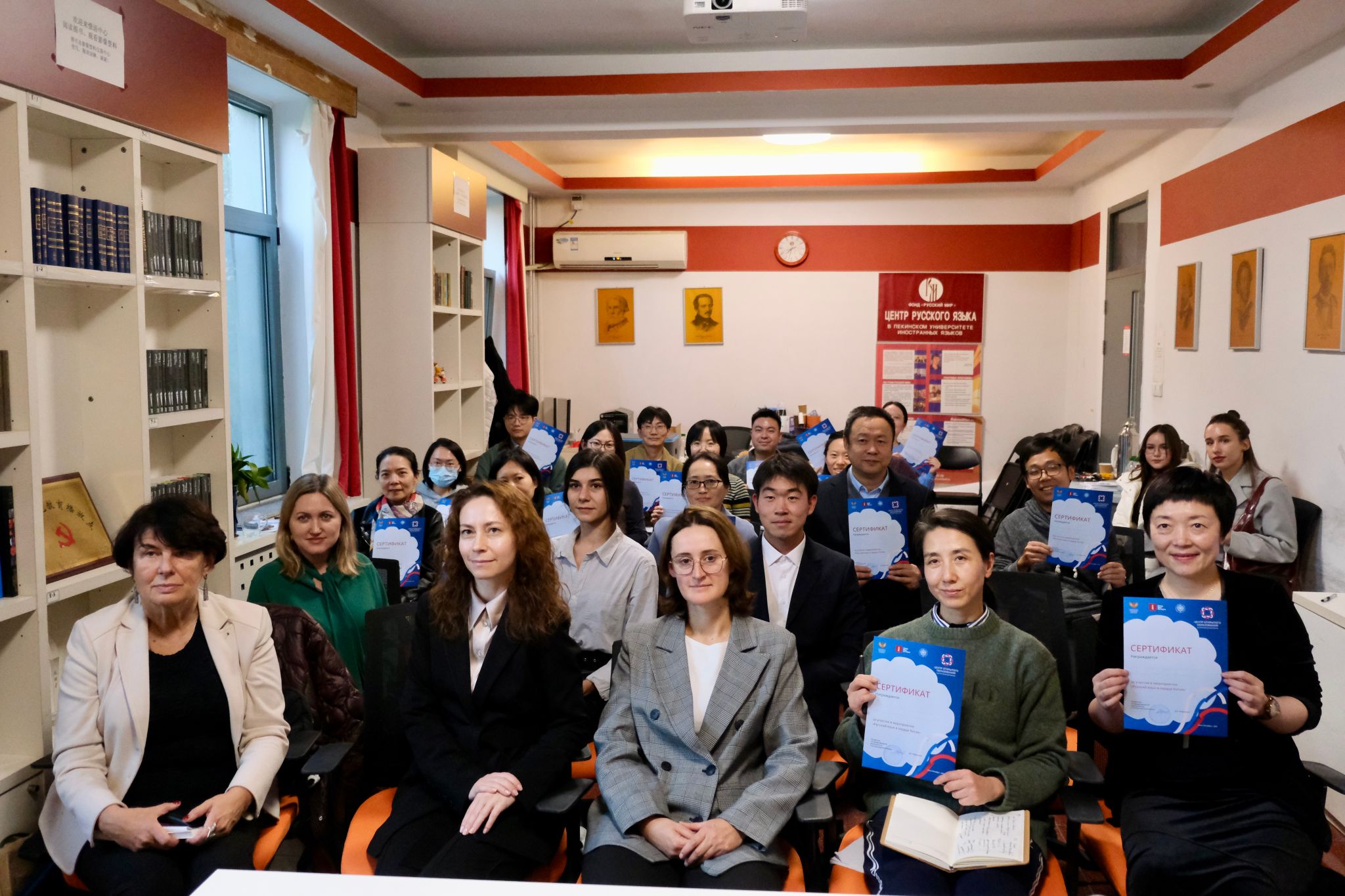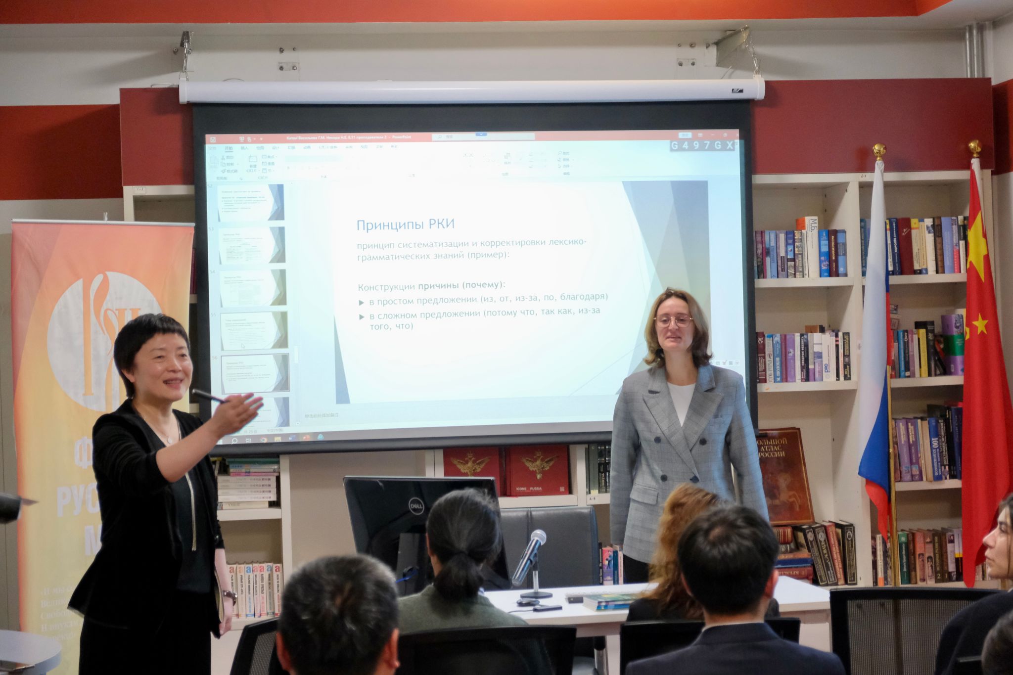11月6日,俄罗斯赫尔岑国立师范大学代表团与PA捕鱼官方网站的教师们在俄语中心进行了一场教学示范与交流研讨活动。活动中,加琳娜·瓦西里耶娃教授以“俄语词汇的语文学内涵”为题,通过讲解面包、外套、雏菊、白桦树等俄语词汇的文化伴随意义,解锁了语词中的文化编码,展示了俄语词汇中丰富的文化意涵和相关领域最新研究成果。娜塔莉亚·内科拉副教授则详细分析了对外俄语语法教学中的难点问题,并分享了相关线上教学资源。在问答环节,两校教师就俄语教学、教法、教材等问题进行了深入交流与研讨。